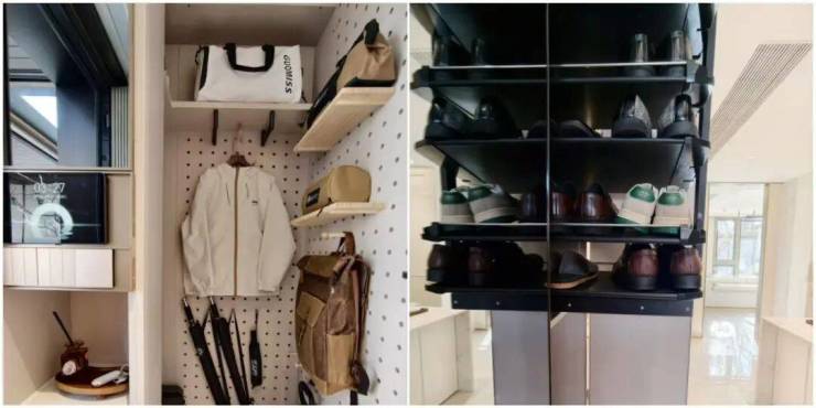 进门玄关处有个800库,深约800mm,路亚箱、滑板、行李箱,随便往里塞。连洞洞板都是交付标准,未来可以自由分区。旁边还配了个可抽拉鞋柜,至少放得下40双鞋,一家三口的鞋全放进去,空间还能有富裕!