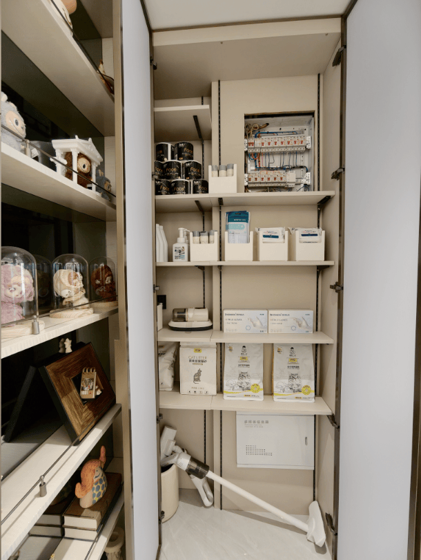 扫把、拖把、工具,全部收进去,门一关,家里干干净净。预留了插座,扫地机、吸尘器、洗地机,想放哪个放哪个,再也不用满屋子找插座充电。