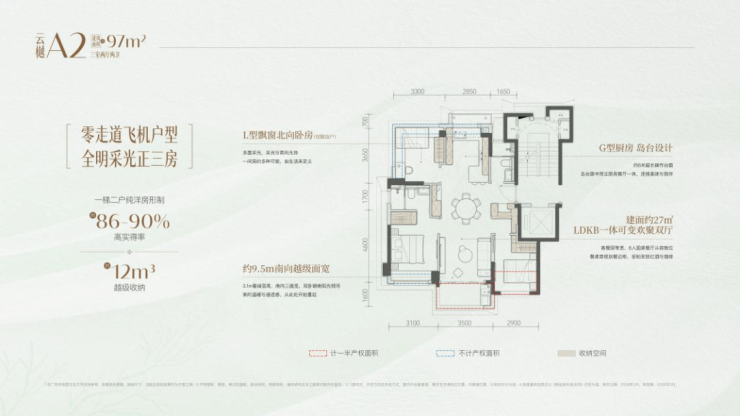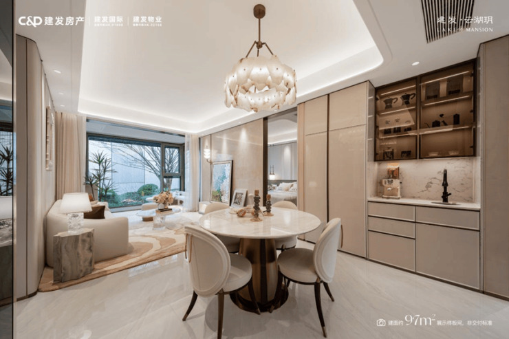 建发云湖玥的餐厅宽度和客厅基本同宽。一般97㎡的房子,餐厅都是被挤在角落里的小长条,放张桌子人就没地儿了。