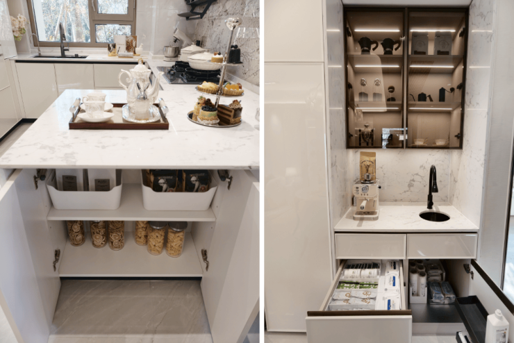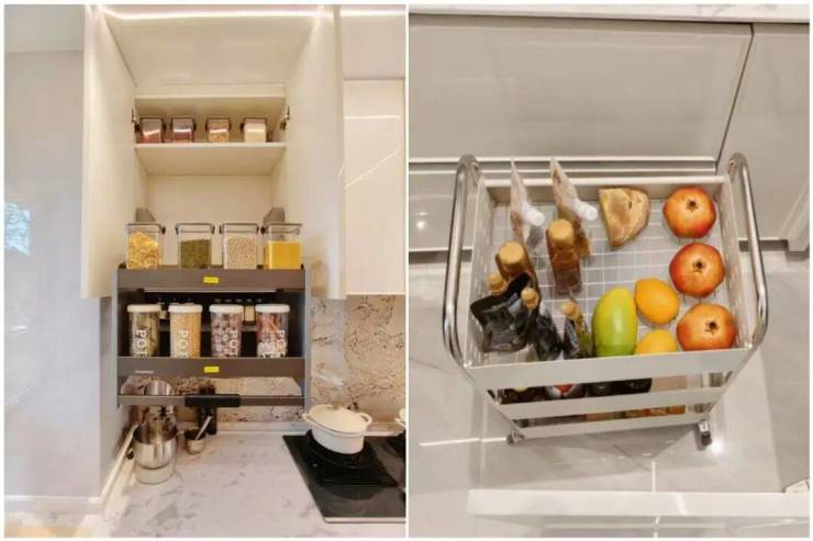 食品库在厨房里,吊柜里的小家电收纳区、折叠置物架、升降拉篮、手动吊柜拉篮……全给你安排得明明白白。岛台内部藏着“隐藏式”小推车和拉篮,外侧还有专门的收纳格。