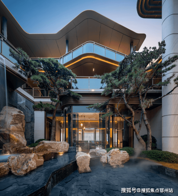 以水、风雨连廊、空中悬挑平台串联山水相依风雅景致 , 呈现三层立体园林及 约15 米飞石叠瀑景观,营造出丰富的空间层次感,中央布置大面积立体水景,如诗如画。