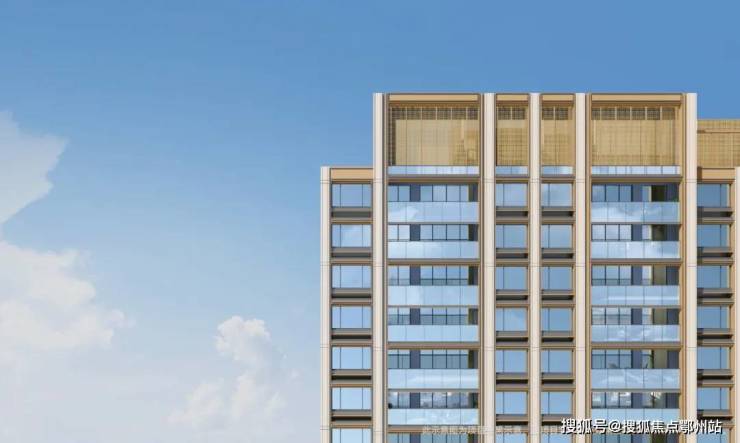 金色飘檐擦亮辨识度,南立面以大面玻璃主打,白、金、蓝灰为主调,配合部分涂料;基部用上了贝金米黄大理石,温润如月光。