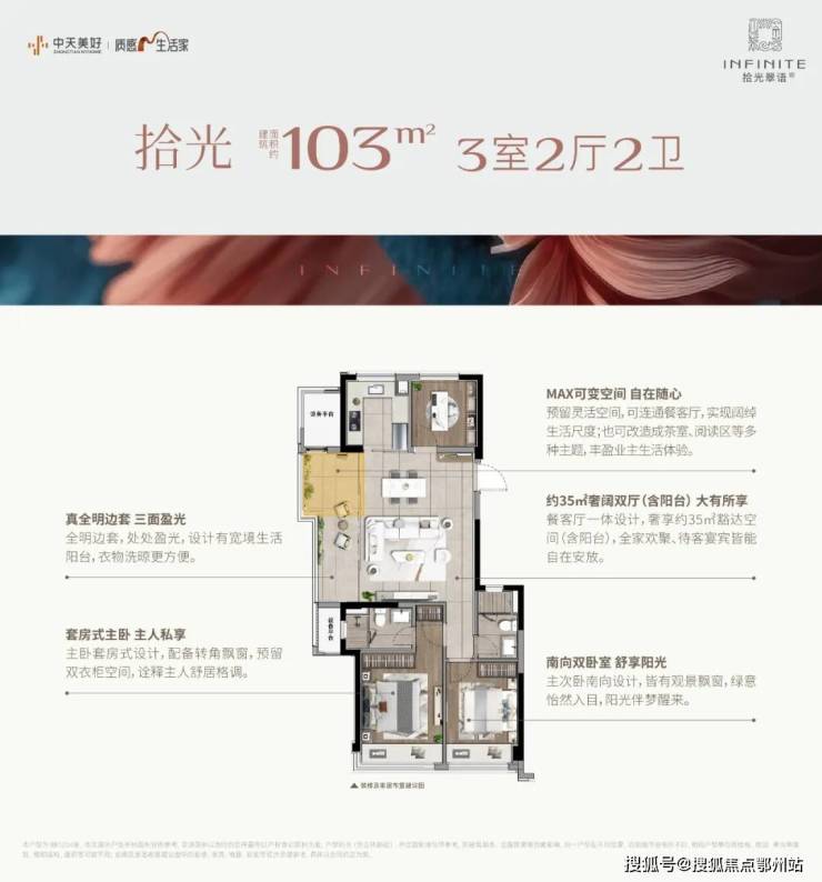 建面约103㎡的边套 更是堪称神迹,将小户型的空间魔法玩到了极致。 客厅到阳台的地面 、 天花直接拉通 , 甚至两侧的墙垛都已隐身 , 整个餐客厅面积达到约35㎡ (含阳台),这可是140㎡以上大宅才有的空间感!