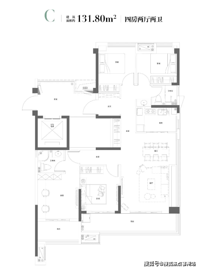 灵活空间:97㎡三房可变大横厅;108㎡/131㎡边户可改四房