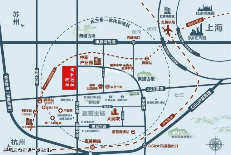 从嘉善南站乘坐高铁到上海松江仅需14分钟,而到上海虹桥仅需23分钟,此外通过G60高速、申嘉湖高速可快速连接上海的重要中心位置,到亚洲较大交通枢纽虹桥枢纽大约50km,其中,申嘉湖高速是浙江前往上海浦东机场的便捷通道,通过沪昆高速可一站直达上海、昆山两地,极大丰富嘉善与上海及环沪城市的联动。