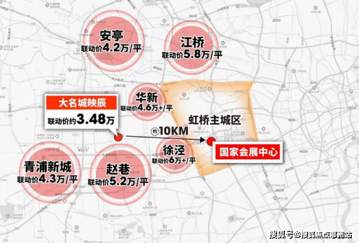 其次,对比大虹桥,大虹桥新房普遍6万+/平方米,二手房则更是突破9万/平方米(如蟠龙天地、万科天空之城等),而车行时间相距仅约15分钟的大名城·映辰仅3.48万/平方米,价差明显,相当于新房的58折,二手房38折。