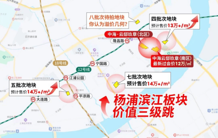 今年的杨浦滨江摁下房价加速器,土拍经历从6.9万/㎡—9.2万/㎡, 涨约30%! 新房未来预计也将 迈上13-14万/㎡!