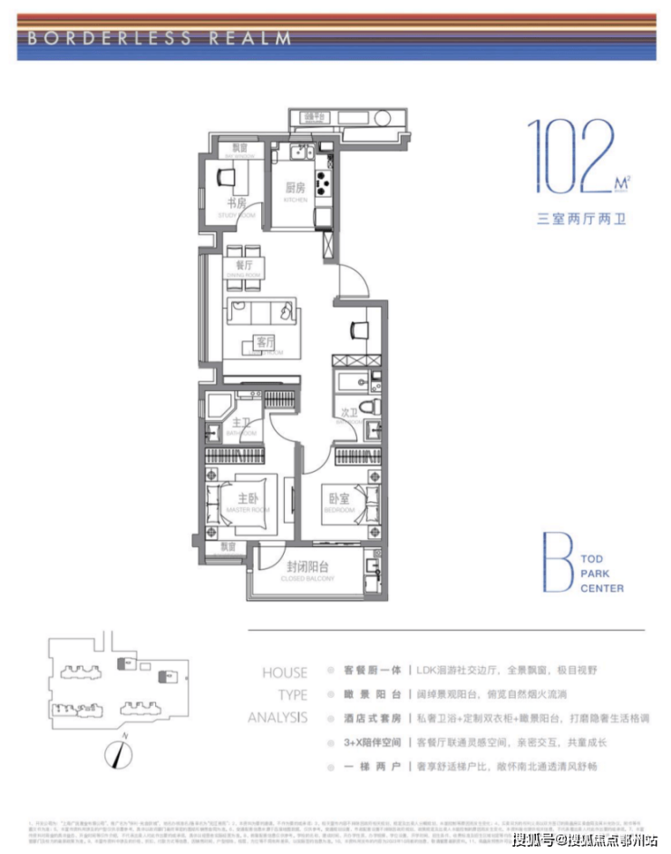 建面约102m²户型特点: LDK洄游式景观边厅,景致拉满,3+X陪伴空间,承载更多自定义功能需求,开放式厨房,烹饪与客餐厅无界互动。