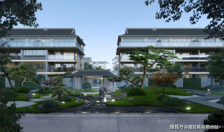 园林设计灵感来源于临平山上塘河,引山水入园,演绎宋式精工居所,整体遵循宋代江南水乡的古城肌理,展现大宅的隐奢调性,营造出“居山水、观天地”的空间意境。三进二庭五园的山水轴布局,两轴九景四时的极致意境生活。