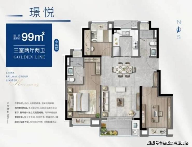 99m²3房2厅2卫高层户型,同样三开间朝南,采光效果极佳;大开间客厅,媲美豪宅的尺度感。主卧套房,步入式衣帽间设计,提升居住舒适度。