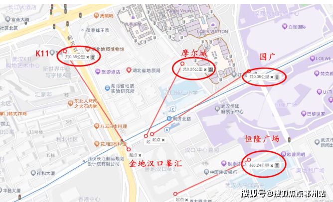 商业上,小区被武汉高奢商场环绕,最近的就是恒隆广场,步行200米左右就到了,同时摩尔城、K11、武汉国际广场距离项目的直线距离也不超过400米。