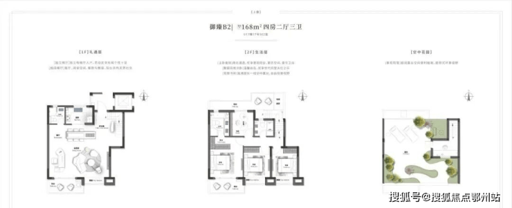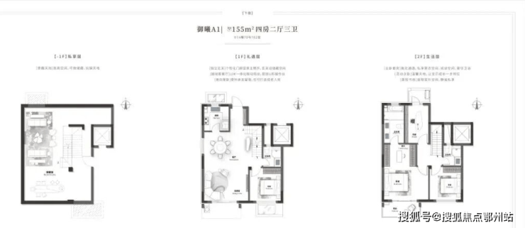 上叠: 三层长辈房+奢阔一体化客餐厅,U型厨房空间;四层三房两卫布局,尊享主卧套房;北侧星空露台及顶层,美好生活自由定义。