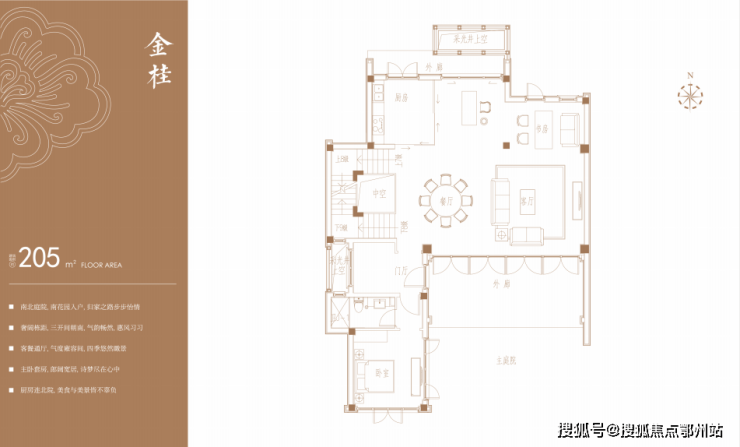 建面约175-380㎡合院:涵盖月桂(177㎡)、丹桂(185㎡)、银桂(186㎡)、金桂(205㎡)及龙梅(788㎡)。
