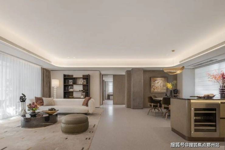 而且项目尺度虽阔仍对面积极致利用,客餐厅一体化的设计造就了全市豪宅领域鲜有对手的超大公区,客厅面积约60㎡,餐厅区一侧轻松放下多人大圆桌,足以盛放各类家族、亲朋聚会。