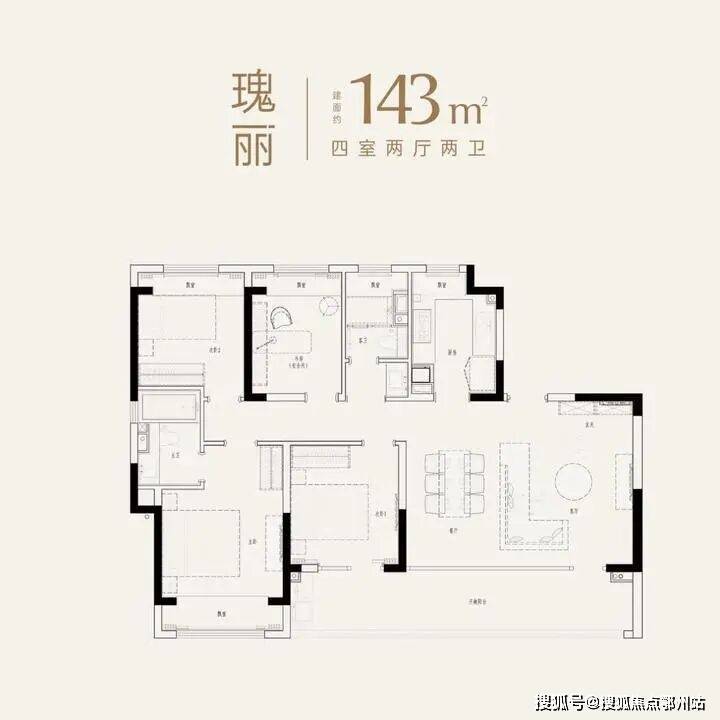 建面约143㎡,四房两厅两卫,大面宽短进深,南向四开间朝南。大横厅设计,餐客厅一体,双联阳台,主卧套房带独立卫浴。
