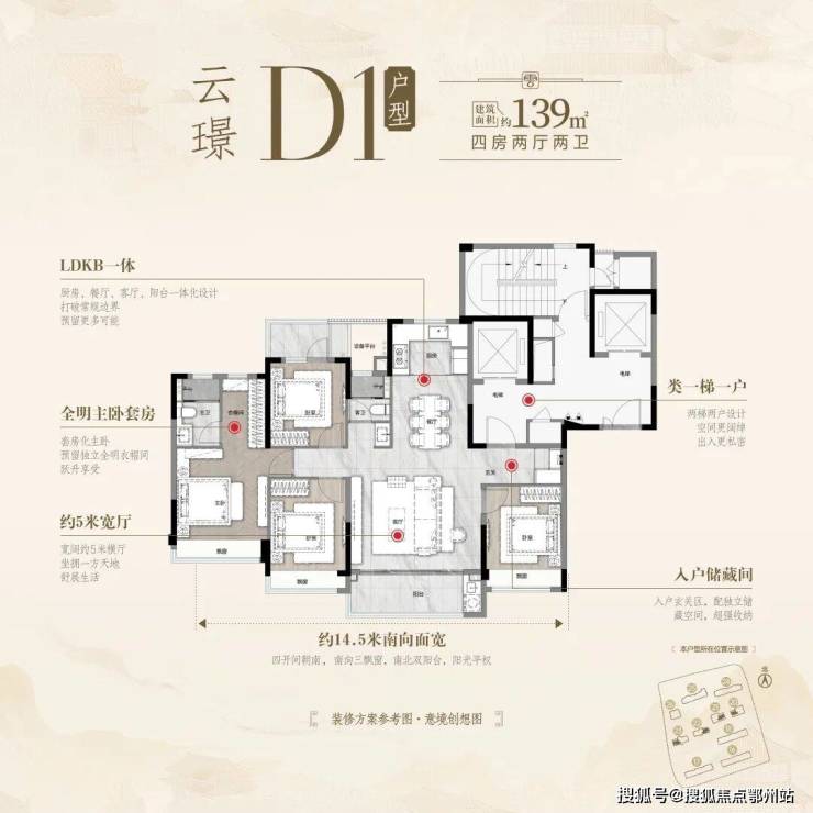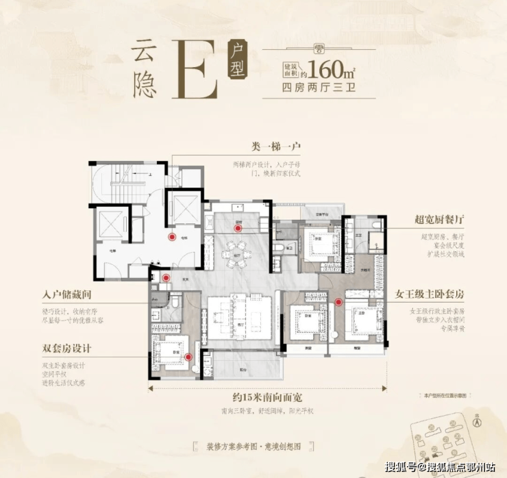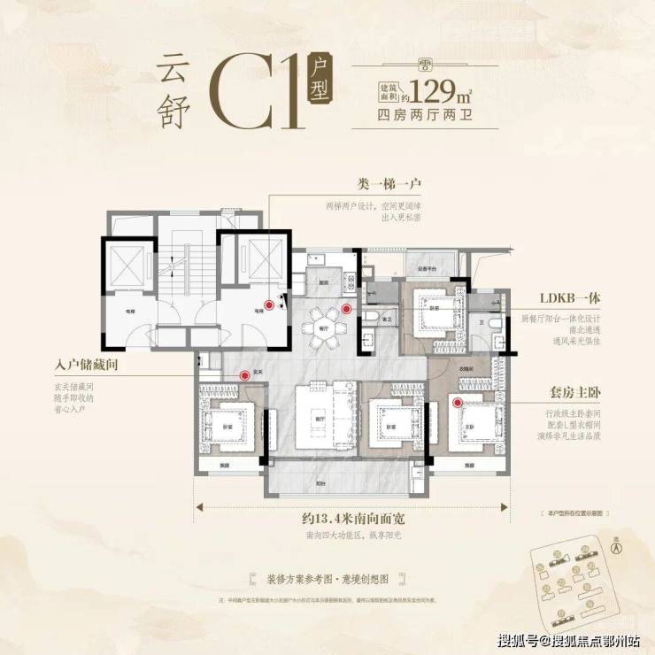 建面约129方四房两卫:
