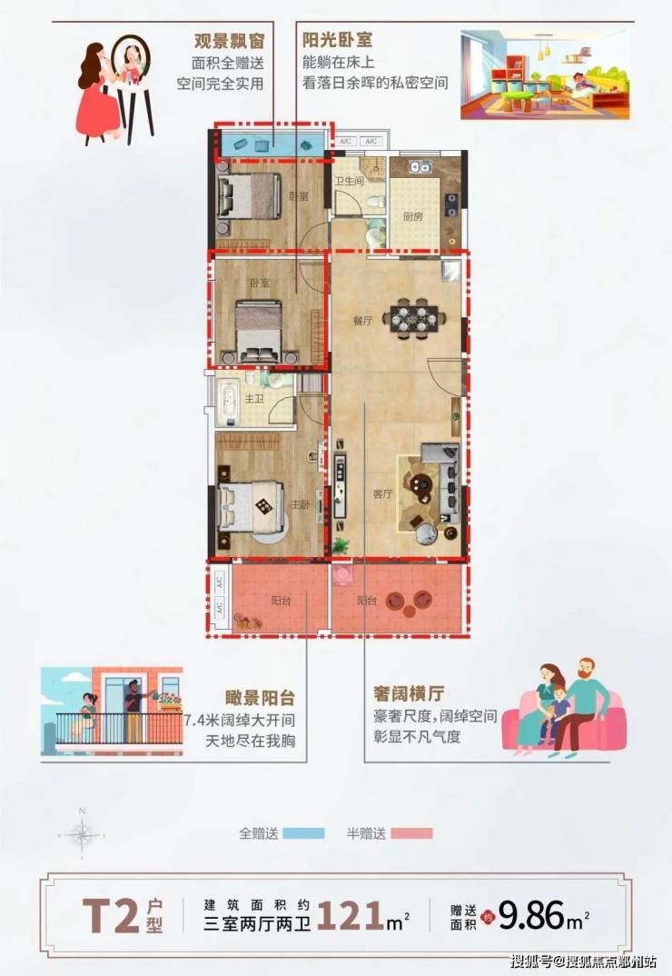 此户型采用 南北三阳台的设计,配置明确分区,生活、景观同时兼顾。