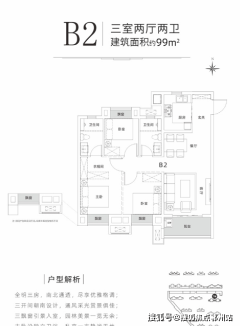 3开间朝南,主次卧均带有飘窗,可拓展一定面积。