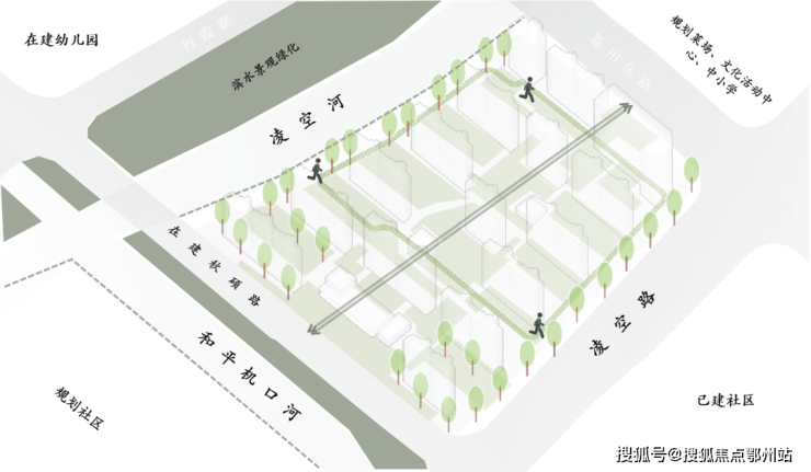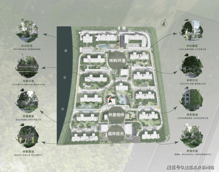 社区采用 中轴对称的方式,形成以交流会客、儿童活动、休闲放松、户外运动等在内的 “一园十境”特色场景景观布局,使得各个楼栋的 景观分布和采光感受更均衡。