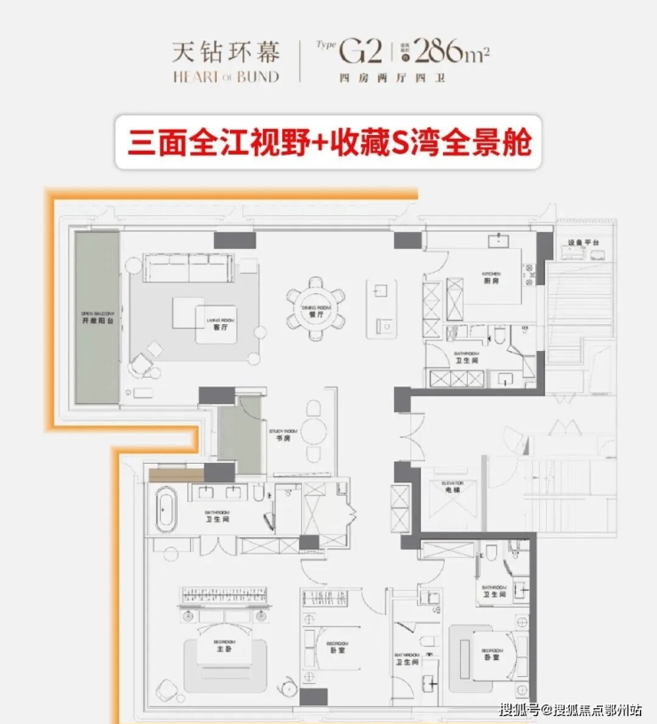 ④三卧全尺度奢适,主卧临窗浴缸瞰江!X空间定制方案可选,实现多场景布置!