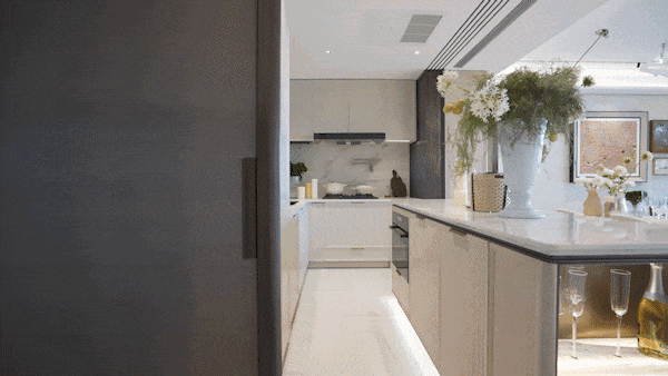 另外,因为豪宅客户对于精装美学有自己的审美,所以此次项目提供了超越行业的 三大柔性定制 ——艺术家联名定制入户门把手、艺术家联名定制艺术门牌挂画以及墙面饰面&岛台等区域提供多款石材/岩板款式。