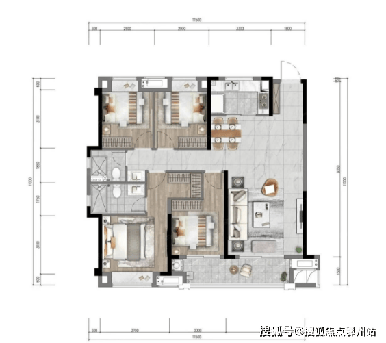 建面约112㎡,三房两厅两卫:边户,三开间朝南,空间布局与112平中间户类似,不过南北通透,舒适度要高,北侧卧室多了一个飘窗。