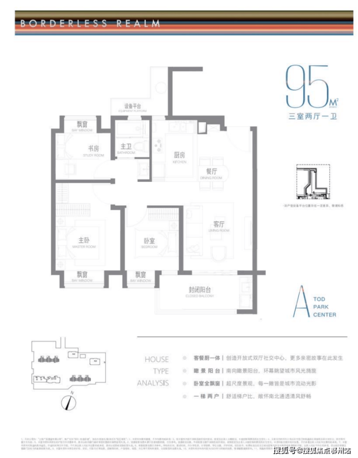 建面约95m²户型特点: 开放式厨房,极度释放厨房与客厅的尺度与互动可能,无连廊设计,一梯两户极致梯户比,南北通透舒适感