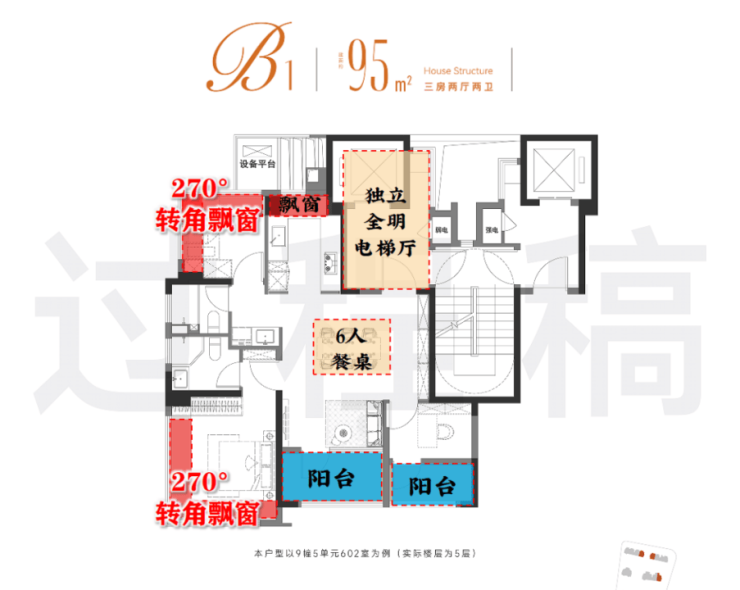 在建面约95㎡的3房中,与建面108㎡户型在设计理念上有许多的共通之处。