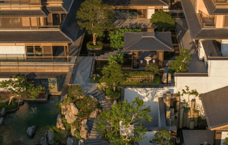 小而精致的四水归堂,形成内敛的氛围,引入自然天光的同时成为室内空间的衬托风景;在主庭院与侧庭院,设计运用通透玻璃立面结合檐下灰空间,形成开阔、无界的交互感受。建筑于此消隐,自然于此显形;二三四层环绕套房的“空中庭院”,日常之中便可缓步沉浸在一副流动的山水画卷中。 搜建筑