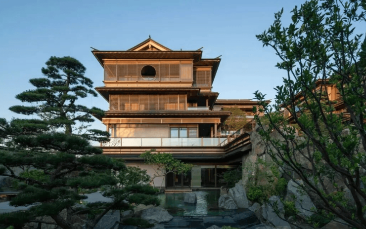 山水是地上之文章。 如果将园林的整体营建看作一首诗,那么园林建筑就是诗中的“诗眼”。“泉香”取形于传统的宫殿高台,意随宋风,四层楼高的楼阁平作式建筑整体呈现一种纯和之气、简约之美。 建筑主体下方是稳重的基座,上部采用重檐叠顶形成高阁意象。虽然装饰减少,但线条偏硬朗,形体比例更加舒展,艺术风格也更加细致、清新与灵动,且更符合杭州历史文化与现代人的审美取向。