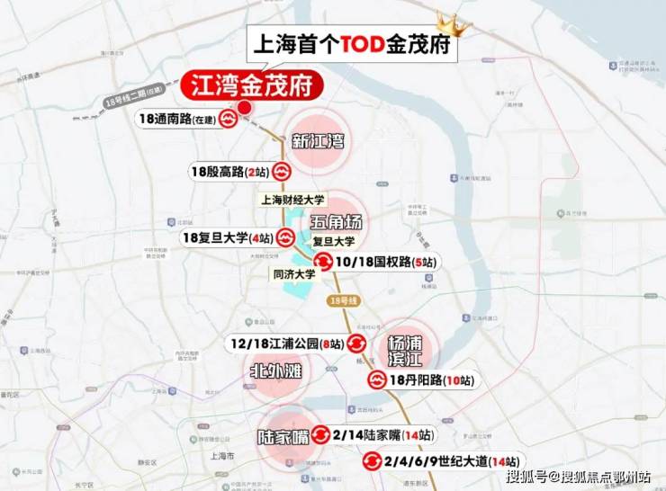 从通南路站(在建)出发,1站就是新江湾,3站财大,4站复旦,5站五角场,7站新华医院,10站杨浦滨江,11站陆家嘴滨江...