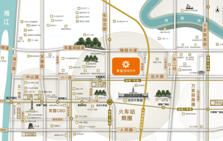 五大商圈:项目坐拥长沙火车站商圈、人民路商圈、芙蓉CBD商圈,中山路商圈,五一商圈,万家丽商圈;
