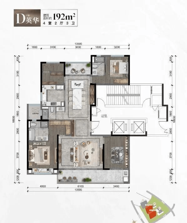 2号栋和3号栋全部都是192平米的户型,圈层非常的纯粹,192平米户型设计了四房两厅三卫,双套房设计和双阳台设计,南北通透,其中南阳台开间高达9.5米,10%以上的赠送面积,是一个经典的四叶草布局。