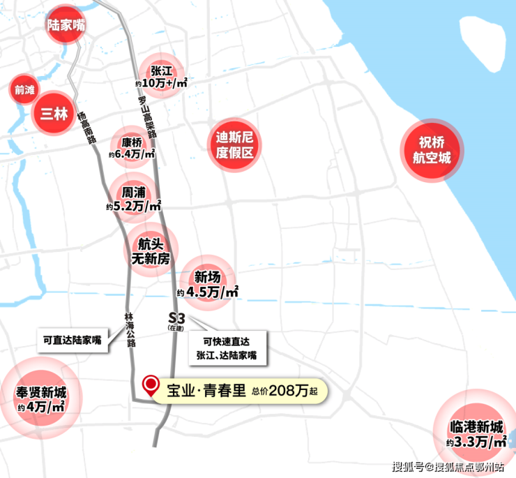 从张江沿着S3(在建)一路南下,张江的房价如今已到了“高不可攀”的程度。
