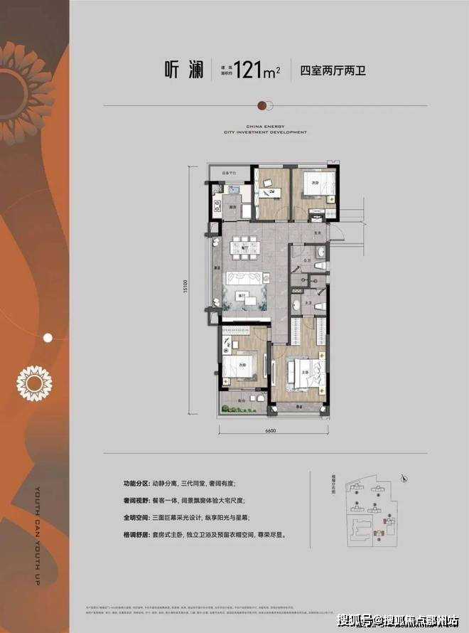 建面约121㎡户型四房两卫设计,做到了市面上很多130+㎡才有的功能性,比如听澜户型包括客厅大飘窗,自带南向阳台,三面采光,无论是会客还是一家人欢聚,游刃有余。
