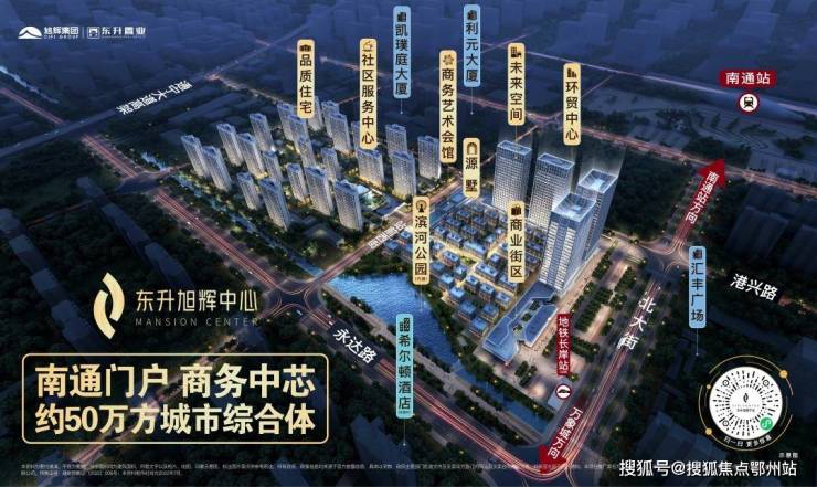 这个项目叫东升旭辉中心,占位南通站前商务区,一个体量约50万方、包含八大业态的“超级地产项目”。