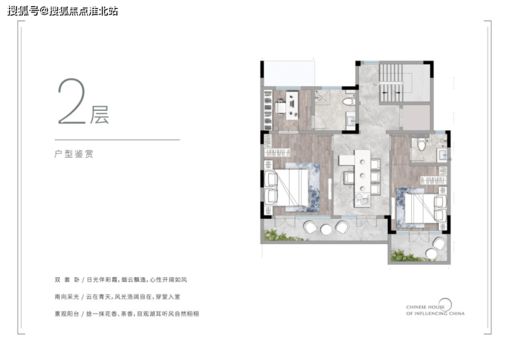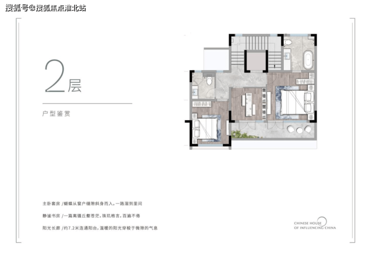 二楼三个功能间均朝南,约7.2米的双联阳台衔接着朝南书房和套房主卧,未来赏景休闲,再风雅不过;朝南次卧紧靠全明次卫,“类套房”的布局大大提升了居住的舒适体验。