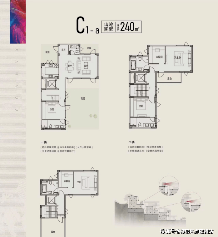 其中一层高度为3.4米,二层高度为3米,三层高度为2.9米,加坡屋顶。地下一层高度介于3.1米到6.6米之间,总价介于850-1200万之间,购买者只需一个月的社保即可购买。