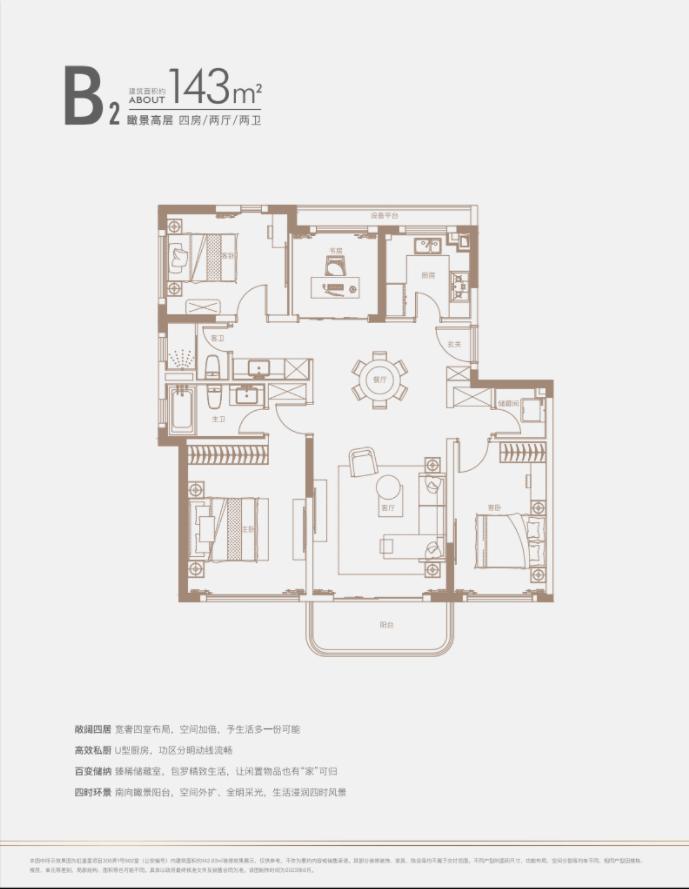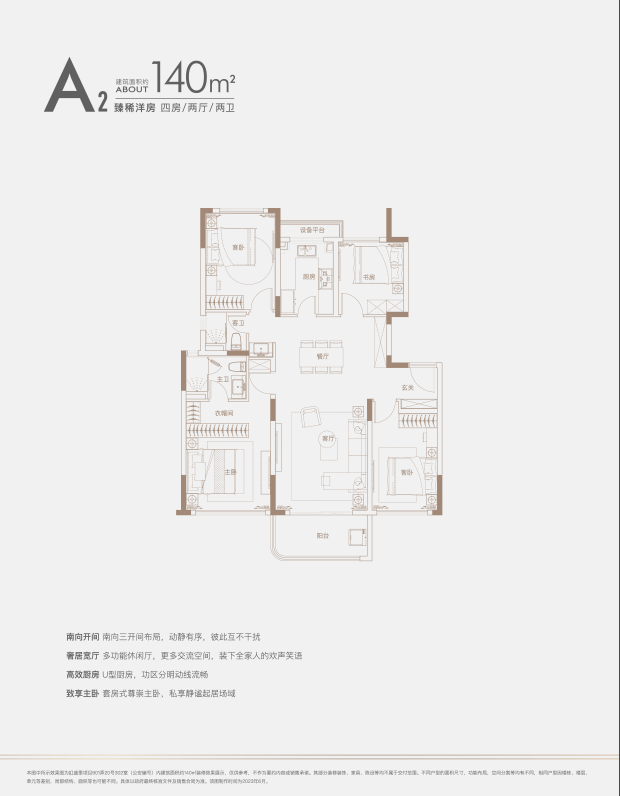 建面约140㎡四房:三开间朝南户型,南北通透,采光条件优质,客厅明亮宽敞,彰显大气布局。