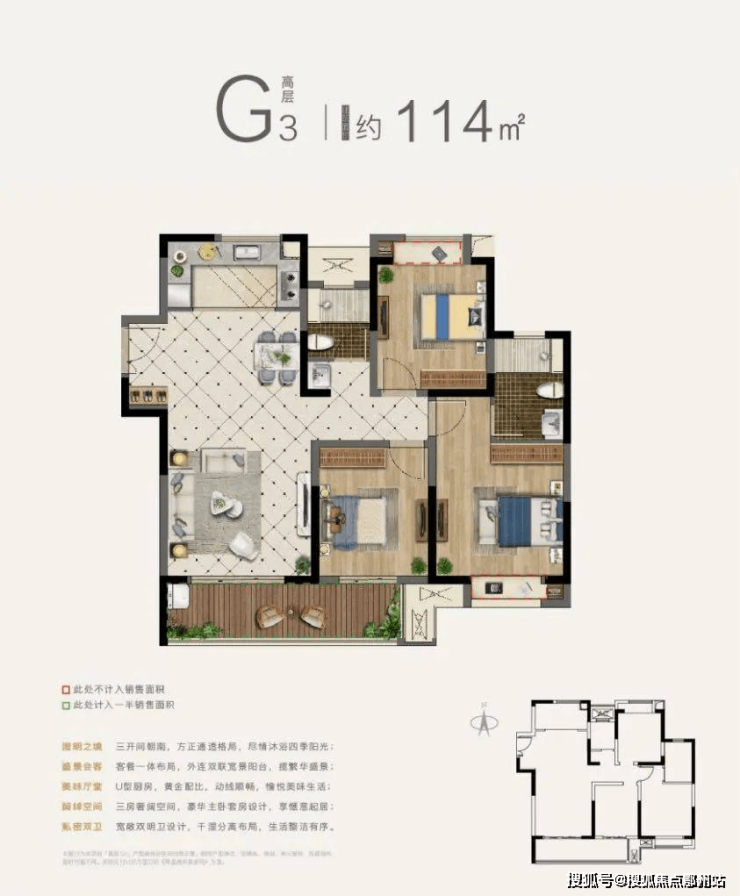 2.居室:(3)室(2)厅(3)卫(1)厨