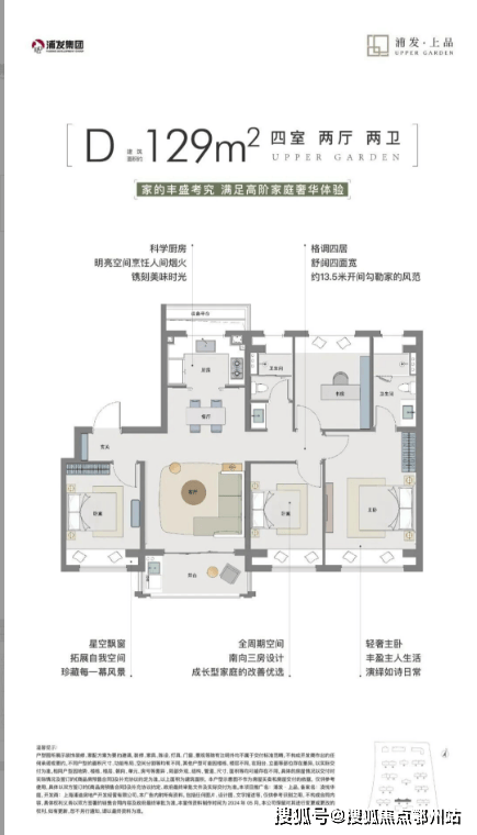 建面约129㎡四房两厅两卫:舒阔四开间朝南设计,全明通透。客餐厅一体化连接景观阳台,空间开阔大气;四个房间分布合理,适配二胎家庭或三代同堂的改善需求,品质感拉满;