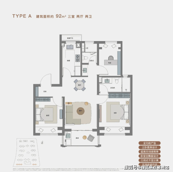建面约92㎡三室两厅两卫:经典飞机户型,三开间朝南,主卧套房带衣帽间,全明通透格局方正,得房率超80%,功能性拉满,非常适合年轻情侣或新婚夫妻首套置业;