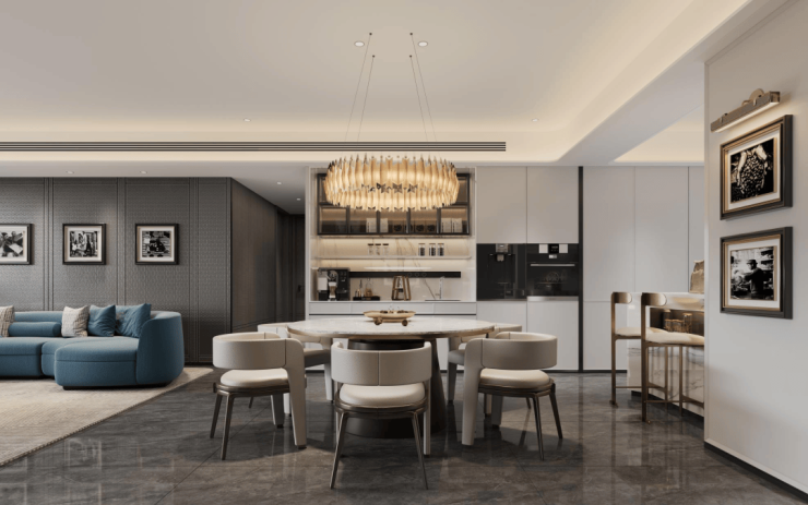 【中央会客厅】 LDKB一体化设计,厨房、餐厅、客厅、阳台彼此联通,客厅通铺至阳台,实现空间场景的多重变化,深化家人间的互动交流。