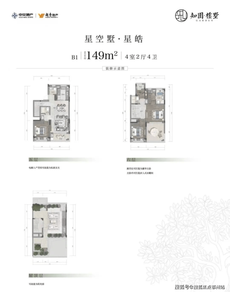 上叠:约144-152平米,独立电梯入户,三层复式结构。上叠中间套,部分户型有六层退露台,约16平米的超大花园露台。屋顶露台超大扩展面积,且飘板设计较大,后期可自行改造利用
