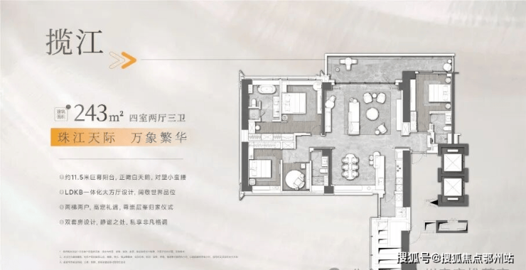 30层面向珠江的楼王户型。它拥有3.3米建筑层高、11.5米宽的超大阳台和2个面向珠江的无敌景观卧室套房,整个珠江前后航道最精华的部分尽收于此。