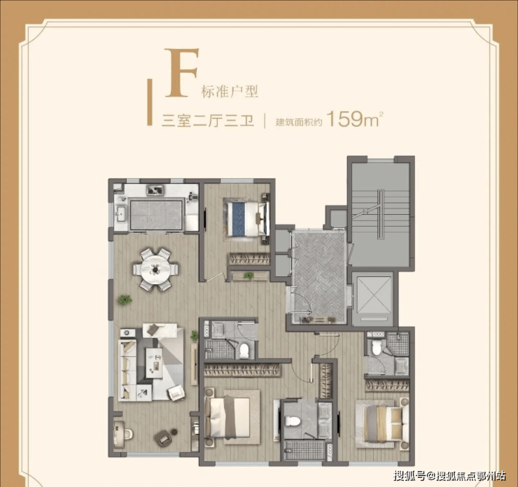 尤其是159㎡的三房,独立电梯厅的面积更是接近10㎡,进一步满足业主的个性化需求。