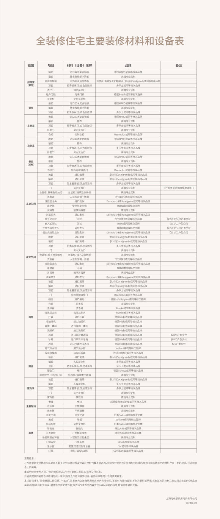 厨房配置了国际顶级厨电品牌之一的 美诺Miel e (或同等档次品牌):蒸&烤一体机,两灶三眼灶台,洗碗机,抽油烟机及冰箱的5件套超高规格,全面提升厨房“含金量”。