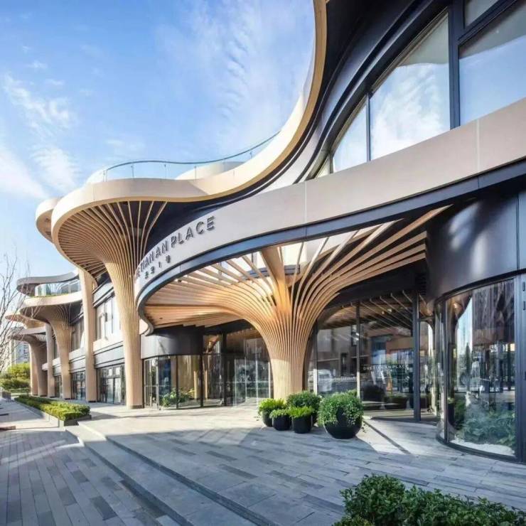 天安1号前期的住宅外立面选用铝板+石材,搭配大面积玻璃,颜值出众!