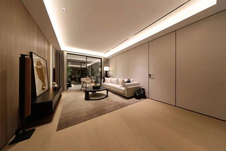 极简审美,从背景墙开始一路延展, 无边框隐形门,以及简化的金属踢脚线 ,让立面保持完整如一。