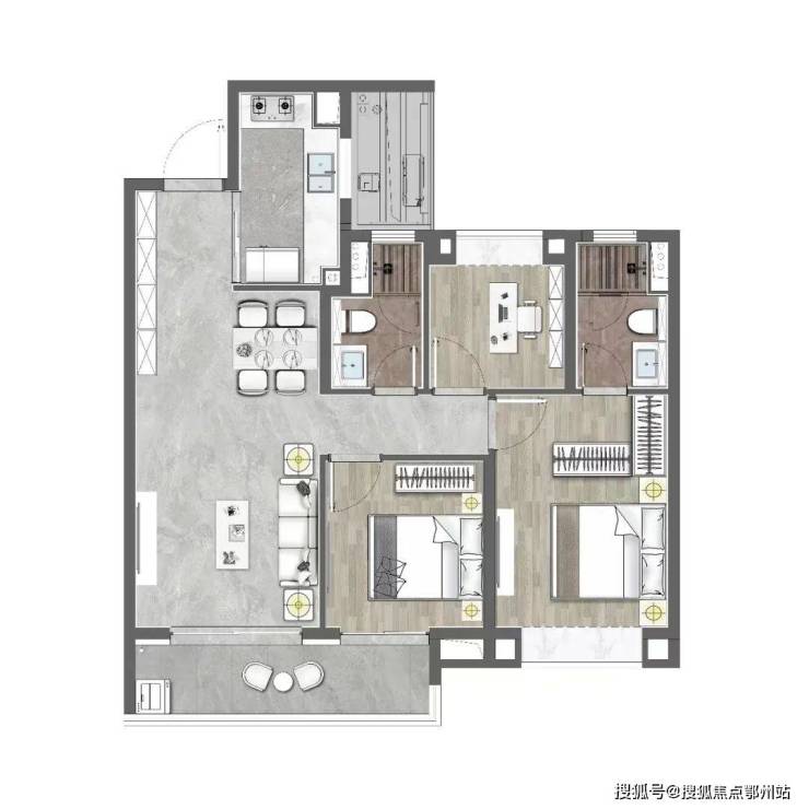 建面约99㎡3室2厅2卫户型,主要位于1、2号楼,1梯2户设计,做到了 三开间朝南+双阳台设计+动静分离+主卧套房设计,功能性和尺度感完美结合。